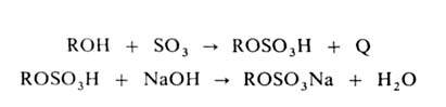 NH4OSO3R. Сульфирование низших спиртов проводят в среде самого спирта, высших-в р-рителе (СНС13, СС14, тетрахлорэтилен). Алкилполиоксиэтиленсульфаты (сульфоэтоксилаты) получают обычно по схеме: