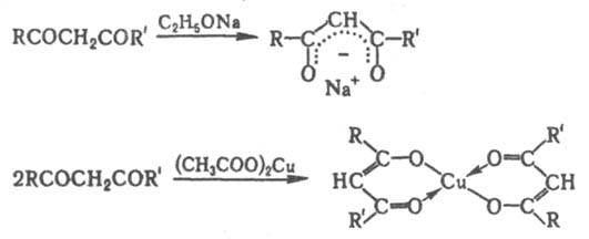 Наличие электроноакцепторных заместителей, напр., в случае полифтор-b-дикетонов, увеличивает кислотность кетоформы и способствует енолизации, а введение объемистых заместителей затрудняет ее. b-Дикарбонильные соединения легко образуют еноляты щелочных металлов, а с солями двух- и поливалентных металлов - прочные внутрикомплексные еноляты, содержащие хелатный цикл (см. b-Дикетонаты металлов), напр.: