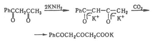 При действии избытка сильного основания на 1,3-дикарбонильные соединения, у к-рых имеются a- и g-атомы Н, образуются соли, содержащие дианионы этих дикарбонильных соединений; в этом случае атака электрофила направляется на g-атом С, напр.: