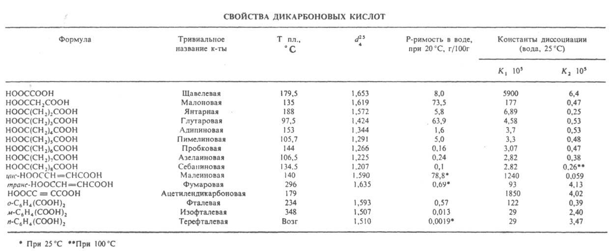 ДИКАРБОНОВЫЕ КИСЛОТЫ, орг. соед., содержащие две карбоксильные группы СООН. Называют их аналогично карбоновым кислотам; многие дикарбоновые кислоты имеют тривиальные назв., которые, как правило, и используются (см. табл.). Дикарбоновые кислоты- кристаллич. в-ва. Т-ры плавления алифатич. дикарбоновых кислот с четным числом атомов С значительно выше, а р-римость в воде меньше, чем соответствующие показатели соседних нечетных гомологов (см. табл.). Первая константа диссоциации дикарбоновых кислот выше, чем соответствующих монокарбоновых к-т, что особенно заметно у низших гомологов.