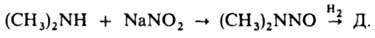 ДИМЕТИЛГИДРАЗИНЫ C2H8N2, мол. м. 60,10; жидкости. Несимметричный диметилгидразин (CH3)2NNH2; т. пл. -57°С, т.кип. 62,8-63,8°С; d420 0,7911; nD20 1,4084; h 0,51 мПа.с (25 °С); DH0oбр-53,5 кДж/моль; очень гигроскопичен; смешивается с водой, этанолом и диэтиловым эфиром во всех соотношениях. Сильное основание: рKa 7,21 (30 °С). Образует устойчивые соли с к-тами, напр., кристаллич. гидрохлорид (т. пл. 81-82°С). Подробнее о хим. св-вах см. Гидразина замещенные органические. В пром-сти его получают: 1) нитрозированием диметиламина нитритами щелочных металлов в кислой среде с послед. восстановлением (кат.- Pd или Pt) образовавшегося диметилнитрозамина: