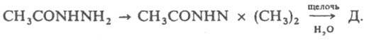 3) восстановительно-каталитич. алкилированием ацетилгидразида формальдегидом и Н2 с послед. щелочным гидролизом образовавшегося диметилацетилгидразида (способ осуществлен в США):