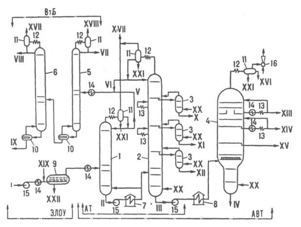 Принципиальная схема комбинированной установки электрообессоливания и дистилляции нефти (регенерация горячих потоков теплоты не показана): 1-6 - ректификационные колонны соотв. отбензинивающая, атмосферная, отпарные, вакуумная, стабилизационная и вторичной перегонки бензина; 7-8 - соотв. атмосферная и вакуумная трубчатые печи; 9 - электродегидратор; 10 - кипятильники; 11 - сепараторы; 12 - конденсаторы; 13 - холодильники; 14 - теплообменники; 15 - насосы; 16 - эжектор; AT, АВТ - соотв. атмосферная и атмосферно-вакуумная трубчатые установки; ВтБ - блок вторичной перегонки бензина; ЭЛОУ - блок электрообессоливания; I, II - соотв. сырая и отбензиненная нефть; III - мазут; IV - гудрон; V-VIII - бензиновые фракции соотв. легкая (начало кипения 85 °С), головка (кипит при 85 °С), 60-150 °С и 85-150°С; IX - сжиженный газ (пропан-бутановая фракция, С3-С4); Х - керосин (150-230°С); XI - зимнее дизельное топливо (180-320°С); XII - компонент летнего дизельного топлива (240-360°С); XIII-XV - соотв. легкий (270-360°С), средний (325-460°С) и тяжелый (380-510 °С) вакуумный газойли: XVI - компонент легкого газойля; XVII, XVIII - соотв. газ низкого (С1-C4) и высокого (C1-C3) давлений; XIX - деэмульгатор; XX - водяной пар; XXI - конденсат; XXII - вода и минеральные соли.