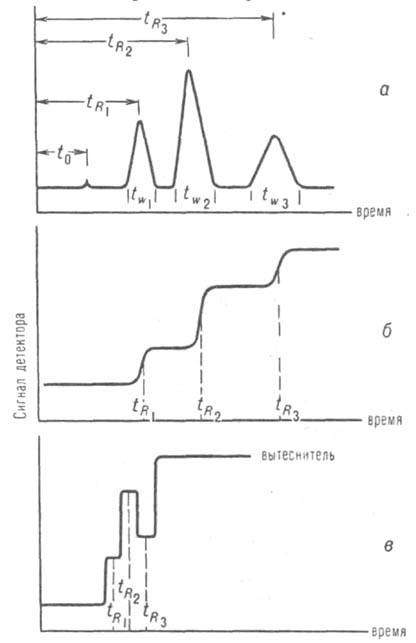 Основные хроматографические величины и их определение. При разделении в-в с помощью жидкостной хроматографии могут применяться проявительный, фронтальный и вытеснительный варианты. Чаще всего используют проявительный вариант, при к-ром в колонку в потоке элюента вводят порцию разделяемой смеси. Выход компонентов смеси из колонки регистрируется на хроматограмме в виде пиков (рис., а). Из хроматограммы определяют времена удерживания несорбирующегося (t0) и разделенных компонентов (tR1 , tR2 и т. д.) и ширину оснований пиков (tw1, tw2 и т. д.). Зная объемную скорость элюента w, вычисляют: мертвый объем колонки Vm = t0.w; исправленный удерживаемый объем компонента V'R = (tR — t0)w = t'Rw, где t'R - исправленное время удерживания компонента; коэф. емкости колонки по отношению к данному компоненту k' = (tR - t0)/t0 = V'R/Vm; эффективность колонки (характеризуется числом эквивалентных теоретич. тарелок) N = 16(tR/tw)2; коэф. селективности a = t'R2 /t'R1 = V'R2/V'R1 = k'2/k'1 и разрешение RS = 2(tR2 - tR1)/(tw1 + tw2). Высота или площадь пиков характеризует концентрацию компонентов, а удерживаемые объемы - качеств. состав смеси. Идентификацию компонентов обычно проводят по совпадению времен удерживания со стандартными в-вами; используют также физ.-хим. или хим. методы.