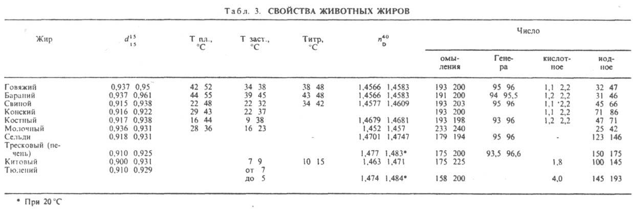 ЖИРЫ ЖИВОТНЫЕ, прир. продукты, получаемые из жировых тканей нек-рых животных. По консистенции делятся на твердые и жидкие, по целевому назначению на пищ., мед., кормовые (ветеринарные) и технические. Твердые жиры содержатся в тканях наземных млекопитающих и птиц, жидкие в тканях морских млекопитающих и рыб, а также в костях и копытах наземных животных. Особое место среди жиров животных занимает молочный жир, составляющий осн. часть коровьего масла (82% сливочного, 98% топленого). Как жирно-кислотный состав (см. Жиры), так и св-ва разл. жиров животных колеблются в зависимости от возраста, пола, упитанности и др. характеристик животного (табл. 1 3). Сырьем для получения говяжьего, бараньего, свиного и конского пищ. жира служит сало-сырец, получаемое при разделке туш животных. Наиб. богаты жиром (80%) клетчатка и ткани, окружающие внутр. органы. Жировое сырье содержит кроме жира влагу (2-10%), белки (0,5-10%) и минер. соли (до 1%). Осн. метод выделения жира - вытопка. Перед вытопкой жировые ткани отделяют от мяса и измельчают. Различают два осн. способа вытопки - мокрый и сухой. При мокрой вытопке сырье находится в соприкосновении с водой или острым паром. Белки соединит. ткани при нагреве гидролизуются, частично растворяются и жир отделяется. При сухом способе содержащаяся в сырье влага испаряется при обычном давлении или под вакуумом. При этом белковые ткани дегидратируются, разрушаются и жир отделяется. Хим. способы вытопки осуществляют нагреванием жировой ткани с разбавленными (1,25-1,75%) водными р-рами щелочей или к-т. Щелочной способ применяют при вытопке свиного жира из мездры, кислотный - для получения техн. жиров.