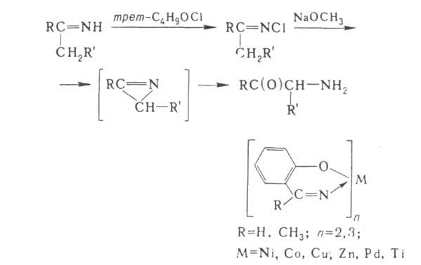 Альдимины и кетимины-промежут. продукты нек-рых р-ций (напр., Лей-карта, Соммле). Ароматич. альдимины и кетимины, содержащие в орто-положении гидроксигруппу (напр., салицилальдимин, о-гидроксиацетофенонимин),-хелатообразующие агенты. Комплексы этих альдиминов и кетиминов с Си или Со-катализаторы окисления фенолов кислородом до хинонов, комплексы с Ti или W-сокатализаторы полимеризации непредельных соед. на алюминийорг. соединениях.