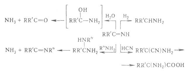 Нуклеофилы присоединяются к альдиминам и кетиминам (особенно легко к соответствующим иминиевым солям) по связи С—N. Схема нек-рых превращений альдиминов и кетиминов приведена ниже: