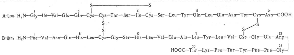 ИНСУЛИН (от лат. insula - остров), гормон, вырабатываемый в поджелудочной железе b-клетками островков Лангерганса. Молекула инсулина человека (мол. м. 5807) состоит из двух пептидных цепей (А и В), соединенных двумя ди-сульфидными мостиками; третий дисульфидный мостик находится в цепи А (см. ф-лу; букв. обозначения см. в ст. Аминокислоты).