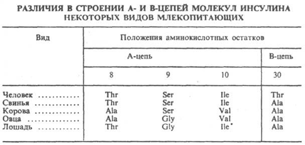 Инсулин обнаружен у всех позвоночных. У крупных млекопитающих молекулы инсулина отличаются по аминокислотному составу только в положениях 8, 9 и 10 цепи А и в положении 30 цепи В (см. табл.). У рыб, птиц и грызунов различия в строении инсулина значительны.