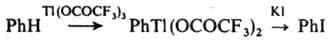 ИОДБЕНЗОЛ (фенилиодид) С6Н5I, мол. м. 204,02; бесцв. жидкость с эфирным запахом; т. пл. -31.3 °С, т. кип. 188,4°C; плотн. 1,8307 г/см3 (20°С), 1,861 г/см3 (0°С); nD20 1,6204; давление пара (в кПа): 1,06 (63 °С), 2,66 (79,6 °С), 4,60 (98 °C); g 38,3.10-3 Н/м (25°С); m 5,7.10-30 Кл.м (в парах), 4,6.10-30 Кл.м (в бензольном р-ре); С0p 112,3 Дж/(моль.К) (-47°С); DH0пл 8,76 кДж/моль, DH0исп 40 кДж/моль. Р-римость в воде 0,34 г/л (30 °С); хорошо раств. в орг. р-рителях. Образует азеотропные смеси с фенолом (53% иодбензола, т. кип. 177,7°С), п-крезолом (88% иодбензола, т. кип. 187,9°С), этиленгликолем (76% иодбензола, 170,2°С)и др. Электроф. замещение в иодбензоле происходит с образованием преим. пара- и орто-производных. При действии на иодбензол жидкого Сl2 на солнечном свету образуются производные от n-хлориодбензола до пентахлориодбензола. Нагревание с I2 в ледяной уксусной к-те при одновременной обработке SO2 и дымящей HNO3 или NaNO2 и дымящей H2SO4 при 200 °С приводит к n-дииодбензолу. При нитровании HNO3 образуются п- и о-нитроиодбензолы (59 и 41% соотв.), при взаимод. с хлорсульфоновой к-той при 0 °С - n,n'-дииоддифенилсульфон, с H2SO4 - n-иодбензолсульфокислота. иодбензол - арилирующий агент; реагирует с KNH2 в жидком NH3 с образованием анилина, дифенил- и трифениламинов; с водяным паром в присут. активированной H2SiO3 (380 °С) образует фенол, с KCN - бензонитрил. Легко окисляется Н2О2 или надсерной к-той до иодозобензола С6Н5IO, озоном или орг. пероксидами - до иодилбензола С6Н5IO2. При действии хлора в безводной среде образуется С6Н5IСl2. Восстанавливается электролитически в спиртовом р-ре NaOH при 70 °С в бензол. Иодбензол получают иодированием бензола в присут. окислителей, необходимых для связывания HI, напр. в среде ледяной уксусной к-ты в присут. НNО3 и H2SO4 выход иодбензола 80%. Известны иодирование бензола в среде ССl4 системой I2-C6H5I-(OCOCF3)2 при 20°С (выход иодбензола 72%), иодом в присут. SbCl5 или тетрафторбората нитрония, а также через таллийорг. соед. (выход 96%):