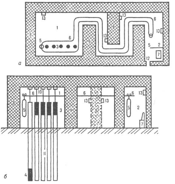На рис. 2 представлена схема гамма-установки для облучения объектов большого размера. В рабочей камере 1 расположены излучающие элементы, к-рые могут находиться в рабочем положении 3 или в хранилище 4 (при таком положении помещение 1 доступно для людей). Объекты для облучения погружаются в контейнеры 5 и по транспортной линии 6 доставляются дистанционно к облучателю 3. Все помещения находятся под дозиметрич. контролем 13. Ионизирующее излучение ядерных реакторов состоит из g-излучения, быстрых и тепловых нейтронов, осколков деления. Ускорители заряженных частиц - устройства, ускоряющие электроны или ионы в электрич. поле (магн. поле м. б. использовано для управления потоком заряженных частиц). Различают два осн. конструкционных типа ускорителей: линейные, в к-рых заряженные частицы движутся прямолинейно, и циклические, в к-рых движение идет по круговой траектории. По типу ускоряющего электрич. поля ускорители делят на высоковольтные, в к-рых направление электрич. поля во время ускорения не меняется, и резонансные, в к-рых непрерывное ускорение достигается за счет того, что заряженная частица находится в ускоряющей фазе переменного высокочастотного электрич. поля. В циклич. ускорителях (циклотрон, синхротрон, синхрофазотрон и др.) требуемая энергия достигается при многократном прохождении ускоряемой частицы по окружности аппарата, в линейных (линейный индукц. ускоритель, линейный резонансный ускоритель и др.) - за счет приложения высокочастотного электрич. поля к линейной периодич. системе электродов. Осн. элементы ускорителя - высоковольтный генератор, источник заряженных частиц (ионный источник) и система, в к-рой производится ускорение. В резонансных ускорителях процесс накопления частицей энергии происходит за определенное время, зависящее от требуемой энергии и типа ускоряемых частиц, поэтому они работают в импульсном режиме. Нек-рые типы высоковольтных ускорителей (напр., каскадный ускоритель) могут использоваться в режиме постоянного потока ускоренных частиц. Большинство типов ускорителей применяют для ускорения как электронов, так и позитронов, протонов, дейтронов, Не2+ и положит. ионов более тяжелых элементов. Резонансные ускорители больших энергий (до десятков ГэВ) применяют в ядерной физике; линейные ускорители с энергией до десятков МэВ - в радиационно-хим. исследованиях (см. Импульсный радиолиз); высоковольтные электронные ускорители - в прикладных целях (используют как ускорители на энергии 0,1-0,5 МэВ с мощностью в десятки кВт, так и ускорители на энергии в неск. МэВ с мощностью до 100 и выше кВт). Перечисленные выше ускорители - аппараты с выведенным пучком заряженных частиц. Но в самом аппарате за счет заряженных частиц можно получить нейтроны или рентгеновское излучение. Нейтроны получают в нейтронных генераторах при бомбардировке ускоренными протонами или дейтронами мишеней из соед., содержащих D, Т или др. нуклиды; получаемый поток может превышать 1011 нейтрон/с (см. Нейтронные источники). Генераторы нейтронов наряду с ядерными реакторами используют в активационном анализе, нейтронографии. Рентгеновское излучение генерируют врентгеновских трубках, в к-рых ускоренные электроны тормозятся в толстой мишени из тяжелого элемента (антикатод); при этом радиац. потери значительны. Рентгеновские трубки выпускают для 