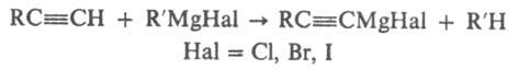 Равновесие сдвигается влево при проведении р-ции в ТГФ или бензоле в атмосфере ацетилена при повыш. давлении и т-ре ок. — 20 °С. Димагнийдибромацетилен получают пропусканием ацетилена в эфирный р-р этилмагнийбромида. Реактивы Иоцича вступают в р-ции, характерные для магнийорг. соед. (см. Гриньяра реакция), но обладают меньшей реакц. способностью, чем реактивы Гриньяра. Реактивы Иоцича широко используют в синтезе ацетиленовых углеводородов, а также прир. соед., напр., витамина А, кароти-ноидов и стероидных гормонов. Р-ция открыта Ж. И. Иоцичем в 1902.