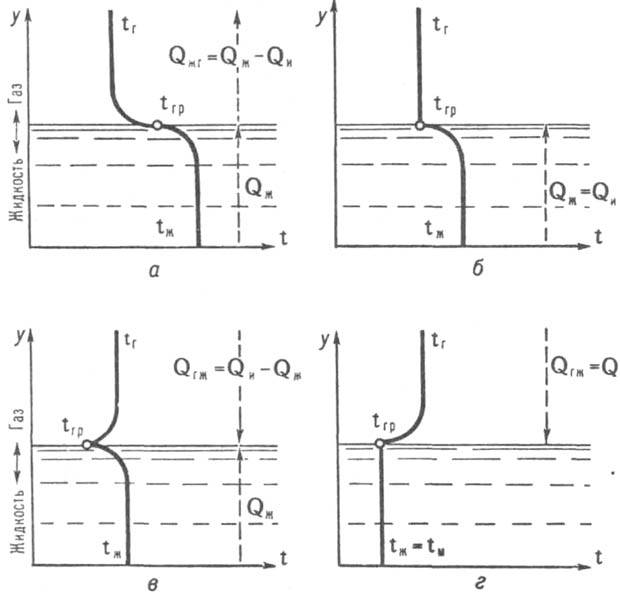 Рис. Распределение температур при различных режимах испарительного охлаждения жидкости. Потоки теплоты направлены: а - от жидкой фазы к пов-сти испарения в газовую фазу; б - от жидкой фазы только к пов-сти испарения; в - к пов-сти испарения со стороны обеих фаз; г - к пов-сти испарения только со стороны газовой фазы.