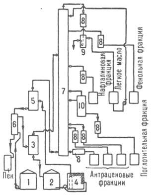 Рис. 1. Одноколонная атмосферная ректификация каменноугольной смолы: 1, 2 - сборники соотв. сырой и обезвоженной смол; 3, 5 -испарители соотв. первой и второй ступеней; 4 - трубчатая печь; 6 -теплообменник; 7, 10 - соотв. фракционная и отпарная колонны; 8 -холодильники; 9 - сепаратор.