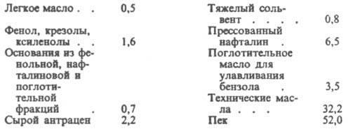 В коксохим. произ-вах часто используют также иные системы ректификации каменноугольной смолы, напр.: двухколонные с двукратным испарением сырья и разделением одной части отгона под атм. давлением и др. части под вакуумом; двухколонные с выносными отпарными, или стриппинговыми, колоннами для поглотительной фракции и с использованием теплоты отходящих фракций для нагрева сырья; двухколонные с двукратным испарением сырья путем ввода дополнит. кол-ва теплоты при рециркуляции донных продуктов. Перспективны одноколонные вакуумные системы с отпарными колоннами для отбора фракций, одноколонные системы с применением в качестве теплоносителя пека и системы с двустадийной обработкой при высоких т-ре и давлении (выход пека до 75%). Из всех содержащихся в каменноугольной смоле индивидуальных в-в наиб. интерес представляет нафталин. Поэтому при ректификации каменноугольной смолы необходимо обеспечить возможно более полное его выделение при одновременном получении остальных продуктов высокого качества, особенно электродного пека и поглотительного масла (см. ниже). Примерный выход и состав фракций, полученных при ректификации каменноугольной смолы на двухколонном атм. агрегате одного из коксохим. заводов СССР, приведены в таблице.