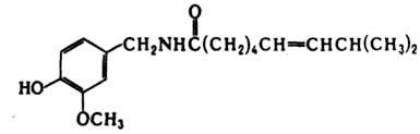 КАПСАИЦИН (ванилиламид 8-метил-6-ноненовой к-ты), мол. м. 305,15; алкалоид, содержащийся в разл. видах стручкового перца Capsicum (напр., в плодах Capsicum Annum ок. 0,03%). Бесцв. кристаллич. в-во со жгучим вкусом; т. пл. 65 °С, т. кип. 210-220 °С/0,01 мм рт. ст.; почти не раств. в водных р-рах щелочей, легко раств. в орг. р-рителях. Химически стоек. В жестких условиях гидролизуется на ванилиламин и 8-метил-6-ноненовую к-ту.