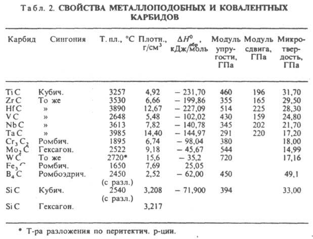 КАРБИДЫ (от лат. carbo - уголь), соед. углерода с металлами, а также с бором и кремнием. По типу хим. связи карбиды делят на ионные (солеобразные), ковалентные и металлоподобные (ионно-ковалентно-металлические). Ионные карбиды (см. табл. 1) образуют металлы I и II гр. (соотв. М2С2 и МС2), РЗЭ и актиноиды (МС, М2С3, МС2), а также Аl. В этих соед. атом С в зависимости от типа гибридизации (sp3, sp2 или sp) образует ионы С4-, (C=C4-, (С=С=С)4-, (C=C)2-. Ковалентные карбиды (см. табл. 2) образуют В и Si; атом С в этих соед. находится в состоянии sp-, sp2- и sp3-гибридизации. Металлoподобные карбиды образуют переходные металлы IV-VII гр., Со, Ni и Fe. В этих карбидах связь металл-углерод ионно-ковалентная, причем атом С отрицательно заряжен, связь металл - металл чисто металлическая, атомы С между собой не связаны.