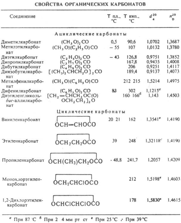 КАРБОНАТЫ ОРГАНИЧЕСКИЕ, сложные эфиры угольной к-ты. Средние ациклич. карбонаты бесцв. жидкости с эфирным запахом (см. табл.); не раств. или трудно раств. в воде, этаноле, диэтиламине, аммиаке, раств. в эфире, ацетоне, бутиламине, бензиламине; образуют азеотропные смеси с водой, спиртами, ССI4, этиленхлоргидрином, гексаном, циклогексаном. Циклич. карбонаты - жидкие или легкоплавкие твердые в-ва; раств. в воде, смешиваются с ароматич. углеводородами, спиртами, карбоновыми к-тами, ацетоном, хлороформом; не раств. в алифатич. углеводородах, CS2; образуют азеотропные смеси с гликолями. В ИК спектрах карбонаты имеют две сильные характеристич. полосы - при 1740-1860 см -1 (nС=O) и 1205-1290 см -1 (nC_O).