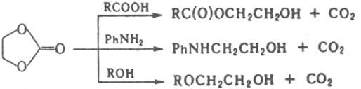 При пиролизе ациклич. карбонатов образуются спирты, этилен и СO2. Циклич. карбонаты при взаимод. с нуклеофилами расщепляются преим. по связи C(R)—О, напр.: