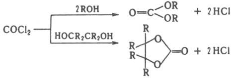 Исключение р-ция с NH3 или алифатич. аминами, приводящая к R2NC(O)OCH2CH2OH; виниленкарбонат в этой р-ции образует R2NC(O)OCH2CHO. Каталитич. гидрирование циклич. карбонатов приводит к 1,2-гликолям и метанолу Диеновым синтезом из виниленкарбоната получены цис-гликоли. Термокаталитич. распад пятичленных насыщенных циклич. карбонатов в присут. щелочей приводит к образованию оксиранов или продуктов их изомеризации (альдегидов, кетонов) и полигидроксиалкенов. Гидролиз циклич. карбонатов используют в произ-ве гликолей. Получают карбонаты взаимод. фосгена или эфиров хлормуравьиной к-ты со спиртами и фенолами при повыш. т-рах в присут азотистых оснований: