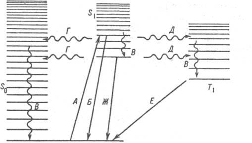 Квантовые переходы между электронными состояниями молекулы: основным синглетным (S0), первым возбужденным синглетным (S1) и низшим триплетным (T1). Прямыми линиями показаны поглощение (А) и излучательные переходы: Б-резонансная флуоресценция, Е-фосфоресценция. Ж-флуоресценция. Волнистые линии-безызлучательные переходы (B-колебат. релаксация, Г-внутр. конверсия, Д-интеркомбинац. конверсия).