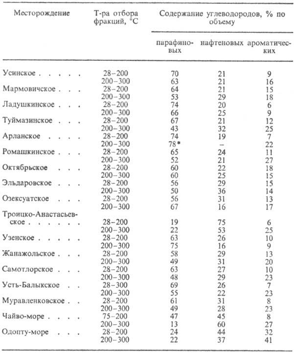 Табл. 5.-ГРУППОВОЙ УГЛЕВОДОРОДНЫЙ СОСТАВ МАСЛЯНЫХ ФРАКЦИЙ НЕФТЕЙ ОСНОВНЫХ МЕСТОРОЖДЕНИЙ СССР