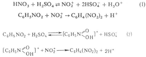По хим. св-вам - типичное ароматич. нитросоединение. Электроф. замещение (хлорирование, нитрование, сульфи-рование) протекают труднее, чем для бензола, что обусловлено сильным электроноакцепторным действием группы NO2. Замещение идет преим. в мета-положение. Нитрование нитробензола протекает по схеме 1 или 2: