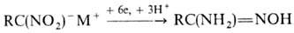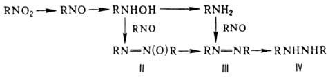 Азокси-(II), азо-(III) и гидразосоед. (IV) образуются в щелочной среде в результате конденсации промежуточно возникающих нитрозосоед. с аминами и гидроксиламинами. Проведение процесса в кислой среде исключает образование этих в-в. Нитрозосоед. восстанавливаются быстрее, чем соответствующие нитросоединения, и выделить их из реакц. смеси, как правило, не удается. Алифатические нитросоединения восстанавливаются в азокси- или азосоединения при действии алкоголятов Na, ароматические-при действии NaBH4, обработка последних LiAlH4 приводит к азосоединениям. Электрохим. восстановление ароматических нитросоединений при определенных условиях позволяет получить любое из представленных производных (за исключением нитрозосоед.); этим же методом удобно получать гидроксиламины из мононитроалканов и амидоксимы из солей гем-динитроалканов: