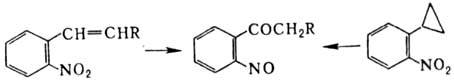 В этих же условиях силиловые эфиры нитроновых к-т трансформируются в силильные производные оксимов. Обработка первичных нитроалканов РСl3 в пиридине или NaBH2S приводит к нитрилам. Ароматические нитросоединения, содержащие в орто-положении заместитель с двойной связью или циклопропильный заместитель, в кислой среде перегруппировываются в о-нитрозокетоны, напр.: