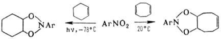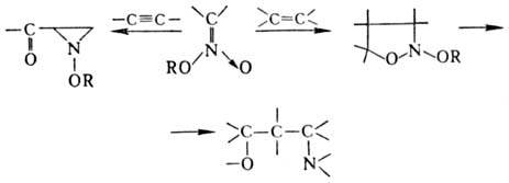 Наиб. легко эта р-ция протекает между нитроновыми эфира-ми и олефинами или ацетиленами. В продуктах циклоприсоединения (моно- и бициклич. диалкоксиаминах) под действием нуклеоф. и электроф. реагентов связи N — О легко расщепляются, что приводит к разл. алифатич. и гетеро-циклич. соед.: