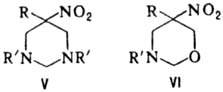 Нитрометан и нитроэтан могут конденсироваться с двумя молекулами метилоламина, а высшие нитроалканы- только с одной. При определенных соотношениях реагентов р-ция может приводить к гетероциклич. соед., напр.: при взаимод. первичного нитроалкана с двумя эквивалентами первичного амина и избытком формальдегида образуются соед. ф-лы V, если реагенты берут в соотношении 1:1:3-соед. ф-лы VI.