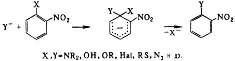 Активирующее влияние группы NO2 на нуклеоф. замещение (особенно по орто-положению) широко используют в орг. синтезе и пром-сти. Р-ция протекает по схеме присоединение-отщепление с промежут. образованием s-комплек-са (комплекс Майзенхаймера). По этой схеме атомы галогенов легко замещаются на нуклеофилы: