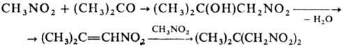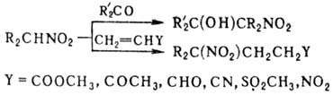 Введение второй группы NO2 ускоряет нуклеоф. замещение. Нитросоединения в присут. оснований присоединяются к альдегидам и кетонам, давая нитроспирты (см. Анри реакции), первичные и вторичные нитросоединения-к соед., содержащим активир. двойную связь (р-ция Михаэля), напр.:
