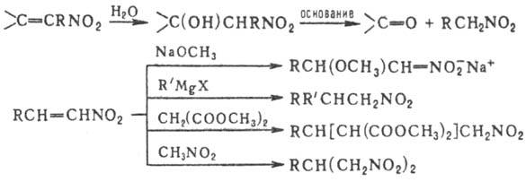 Легко вступают в р-ции присоединения нитроолефины: с водой в слабокислой или слабощелочной среде с послед. ретрореакцией Анри они образуют карбонильные соед. и нитроалканы; с нитросоединениями, содержащими a-Н-атом,-поли-нитросоединения; присоединяют и др. СН-кислоты, такие, как ацетилацетон, эфиры ацетоуксусной и малоновой к-т, реактивы Гриньяра, а также нуклеофилы типа OR-, NR-2 и др., напр.: