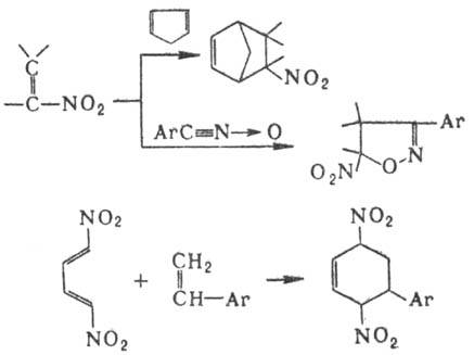 Нитроолефины могут выступать в роли диенофилов или диполярофилов в р-циях диенового синтеза и циклоприсое-динения, а 1,4-динитродиены-в роли диеновых компонентов, напр.:
