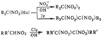 При обработке солей моно-нитросоединений C(NO2)4., нитритами Ag или щелочных металлов либо при действии нитритов на a-гало-геннитроалканы в щелочной среде (р-ция Тер Меера) образуются гем-динитросоединения. Электролиз a-галоген-нитроалканов в апротонных р-рителях, а также обработка нитросоединений Сl2 в щелочной среде или электроокисление солей нитросоединений приводят к виц-динитросоединениям: