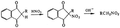 В лаборатории для получения нитроалканов применяют нитрование азотной к-той соед. с активир. метиленовой группой; удобный метод синтеза первичных нитроалканов -нитрование 1,3-индандиона с послед. щелочным гидролизом a-нитрокетона: