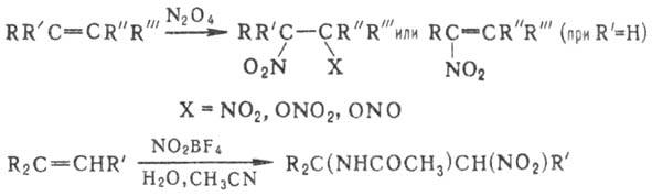 Мн. методы синтеза нитросоединений базируются на нитровании олефи-нов оксидами азота, HNO3, солями нитрония, NO2Cl, орг. нитратами и т.п. Как правило, при этом получают смесь виц-динитросоединений, нитронитратов, нитронитритов, непредельных нитросоединений, а также продуктов сопряженного присоединения группы NO 2 и молекулы р-рителя или продуктов их гидролиза, напр.: