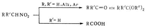 Р-ц и и с р а з р ы в о м с в я з и С—N. Первичные и вторичные нитросоединения при нагр. с минер. к-тами в присут. спиртового или водного р-ра щелочи образуют карбонильные соед. (см. Нефа реакция). Р-ция проходит через промежут. образование нитроновых к-т:
