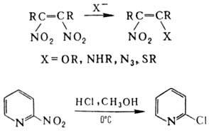 Нуклеоф. замещение группы NO2 не характерно для нитроалканов, однако при действии тиолат-ионов на третичные нитроалканы в апротонных р-рителях группа NO2 замещается на атом водорода. Р-ция протекает по анион-радикальному механизму. В алифатич. и гетероциклич. соед. группа NO2 при кратной связи относительно легко замещается на нуклеофил, напр.: