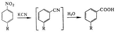 В ароматич. соед. нуклеоф. замещение группы NO2 зависит от ее положения по отношению к др. заместителям: группа NO2, находящаяся в мета-положении по отношению к электроноакцепторным заместителям и в орто- и пара-положениях к электронодонорным, обладает низкой реакц. способностью; реакц. способность группы NO2, находящейся в орто- и пара-положениях к электроноакцепторным заместителям, заметно увеличивается. В нек-рых случаях заместитель вступает в орто-положение к уходящей группе NO2 (напр., при нагр. ароматических нитросоединений со спиртовым р-ром KCN, р-ция Рихтера):