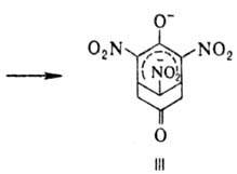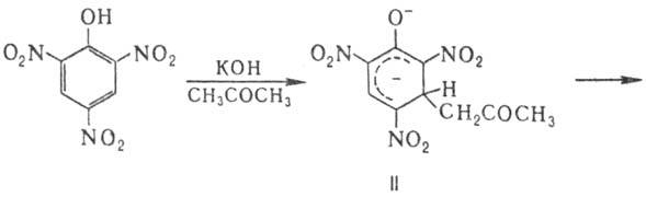 Нитрофенолы обладают св-вами фенолов и ароматич. нитросоедине-ний. Под действием щелочей образуют нитрофеноляты хиноидного строения, имеющие более интенсивную окраску, что позволяет использовать нитрофенолы в качестве кислотно-основных индикаторов. Электроф. замещение для 4-нитрофенола протекает исключительно по положению 2, напр. при алкилировании, нитровании или бромировании. В 3-нитрофеноле замещение протекает гл. обр. по положениям 4 и 6. Так, сульфирование приводит исключительно к 4-сульфокислоте, бромирование - к смеси 4-бром и 4,6-дибромпроизводных, нитрование-к смеси 2,4- и 2,6-динитрофенолов. В присут. щелочей ди- и тринитро-фенолы реагируют с СН-кислотами с образованием окрашенных продуктов присоединения, т.наз. комплексов Май-зенхаймера ф-л II и III, напр.: