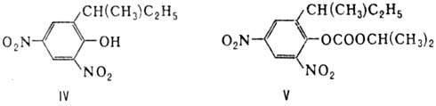 6-втоp-Бутил-2,4-динитрофенол (диносеб) ф-лы IV-инсектицид и гербицид; входит в состав препарата аспитокс; получают нитрованием 2-втор-бутилфенола; ПДК 0,05 мг/м3. (6-втop-Бутил-2,4-динитрофснол)изопропилкарбонат (дино-бутон) ф-лы V-акарицид и фунгицид; получают взаимод. 6-втор-бутил-2,4-динитрофенола с изопропилхлоркарбона-том; ПДК 0,2 мг/м3.