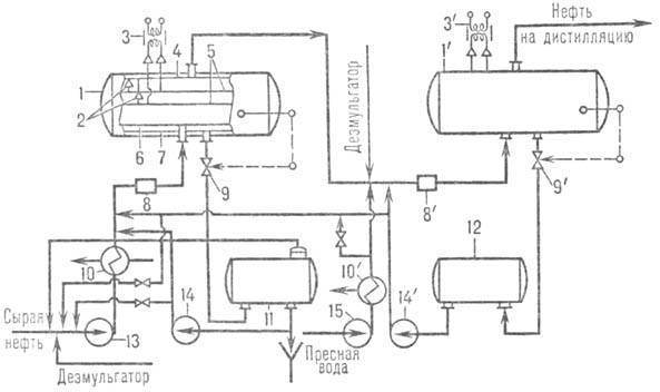 Очистка нефти в двухступенчатых ЭЛОУ осуществляется след. образом (см. рис.). На 1-й ступени сырая нефть подается насосом 13 через теплообменник 10, где она нагревается, в смеситель 8, в к-ром смешивается с промывной водой и деэмульгатором; в электродегидраторе 1 образовавшаяся водно-нефтяная эмульсия разделяется на две фазы. Обезвоженная и частично обессоленная нефть поступает во 2-ю ступень; сначала в смеситель 8', а затем в виде эмульсии с водой-на окончат. очистку в электродегидратор Г; обезвоженная и обессоленная нефть направляется на дистилляц. установку. Пресная промывная вода насосом 15 подается в теплообменник 10', подогревается до 60-70 °С и смешивается с нефтью перед смесителем 8'. Отстоявшаяся в электродегидраторе 1' дренажная вода с помощью клапана 9' поступает в емкость 12, откуда насосом 14' направляется для смешения с нефтью перед 1-й и частично перед 2-й ступенями. Дренажная вода, отстоявшаяся в электродегидраторе 1, через клапан 9 подается в отстойник И, из к-рого после отстаивания и отделения от эмульгир. нефти частично отводится в канализацию, а частично используется для промывки нефти в 1-й ступени. Нефть, отстоявшаяся в емкости 11, смешивается с сырой нефтью на приеме сырьевого насоса 13. В схеме предусмотрены две возможные точки ввода промывной воды в нефть перед 1-й ступенью: на приеме насоса 13 и после насоса 10 перед смесителем 8.