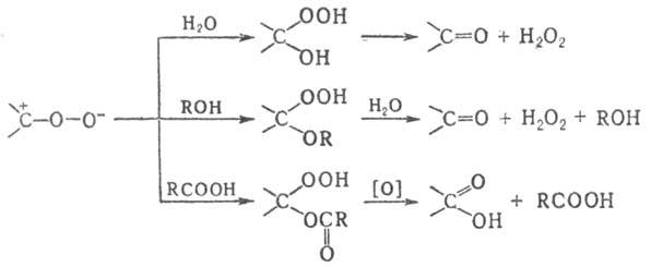 С водой, спиртами и к-тами карбонилоксид образует гидрокси-, алкокси- и ацилоксигидропероксиды, разложение к-рых приводит к альдегидам, кетонам или карбоновым к-там: