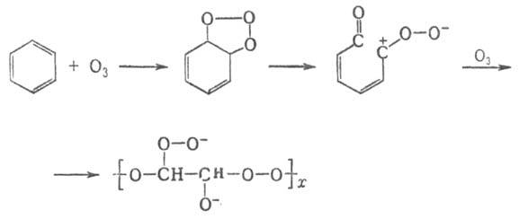 Озонирование ароматич. соед. протекает по типу озонирования олефинов с образованием полимерных озонидов, напр.: