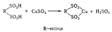 Наиб. практич. значение имеют адсорбционные редокс-иониты, в к-рых редокс-соед. расположены в порах или на пов-сти ионообменного носителя (на практике - обычная ионообменная смола) и химически не связаны с ним. Синтез осуществляют в три стадии: 1) обработка катионита р-ром соли переходного металла (на практике-соль Сu) для перевода в солевую форму, напр.: