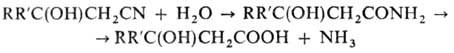 Оксинитрилы вступают в р-ции, характерные для нитрилов и спиртов. Кислотный гидролиз приводит к соответствующим гидро-ксикислотам или их амидам, напр.: