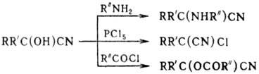 RR'C(OH)CH2NH2. Оксинитрилы реагируют с NH3, аминами, гидразинами, РСl5, хлорангид-ридами карбоновых к-т, напр.: