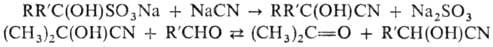 -Оксинитрилы могут быть получены также действием цианидов на бисульфитное соед. альдегида или кетона или обменной р-цией между циангидрином кетона (обычно ацетона) и альдегидом, напр.: